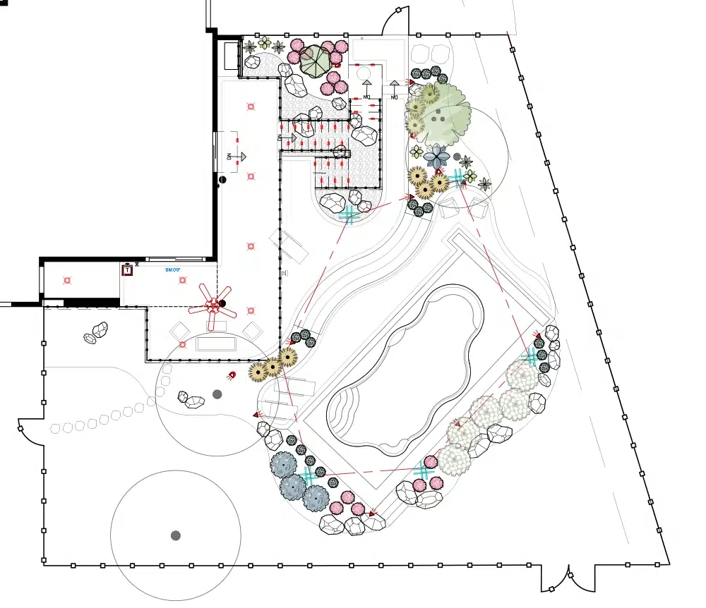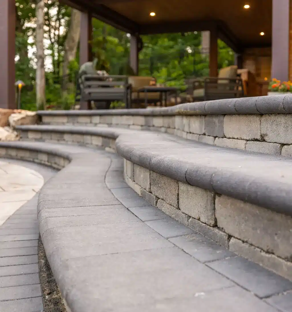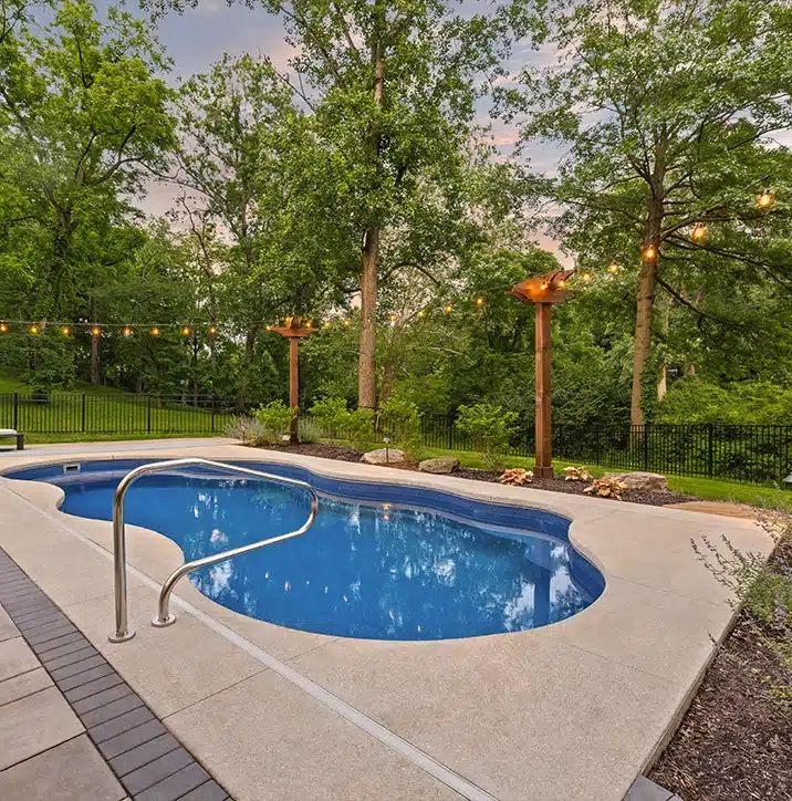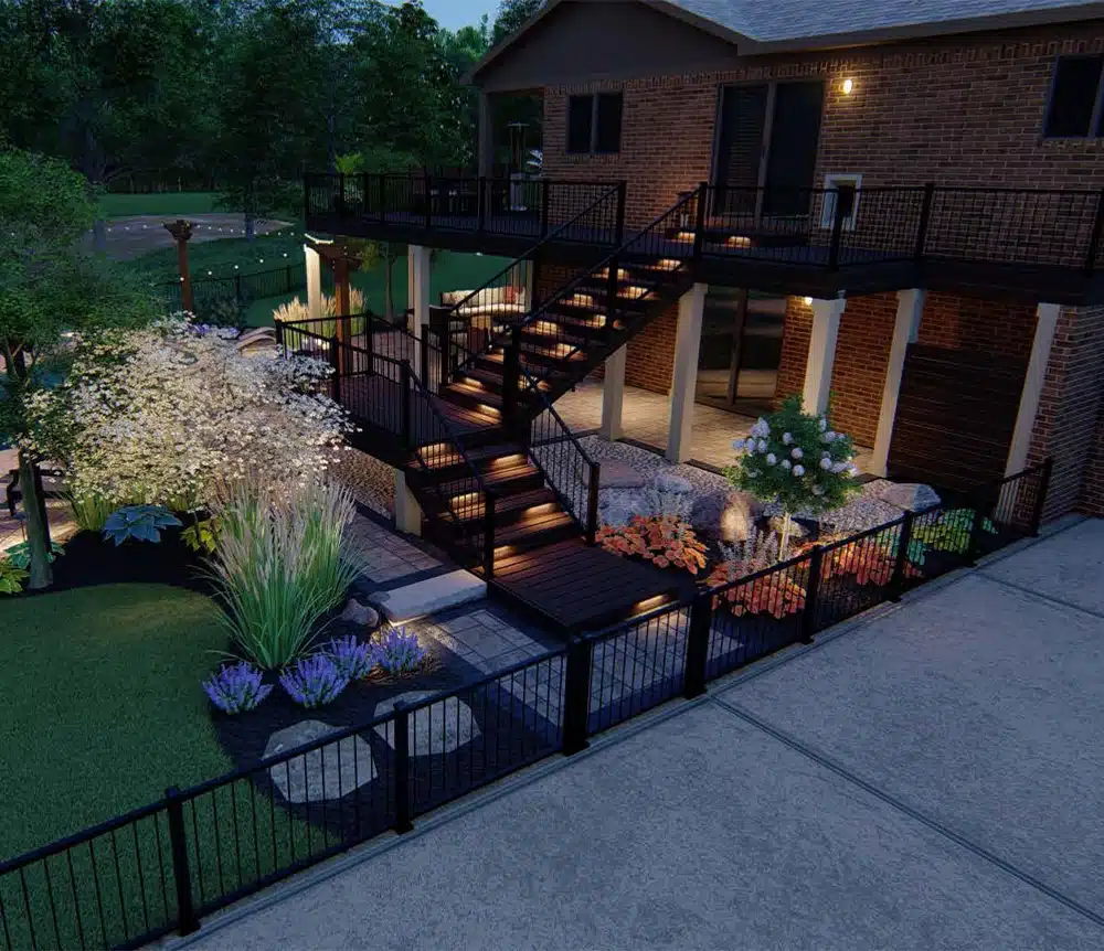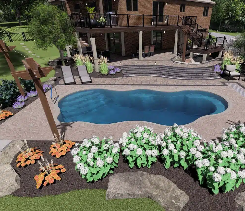 A freeform pool anchors the space, surrounded by tiered hardscaping and curved steps that guide movement and create flow. Bistro lighting ties it all together, extending the experience from day to night.