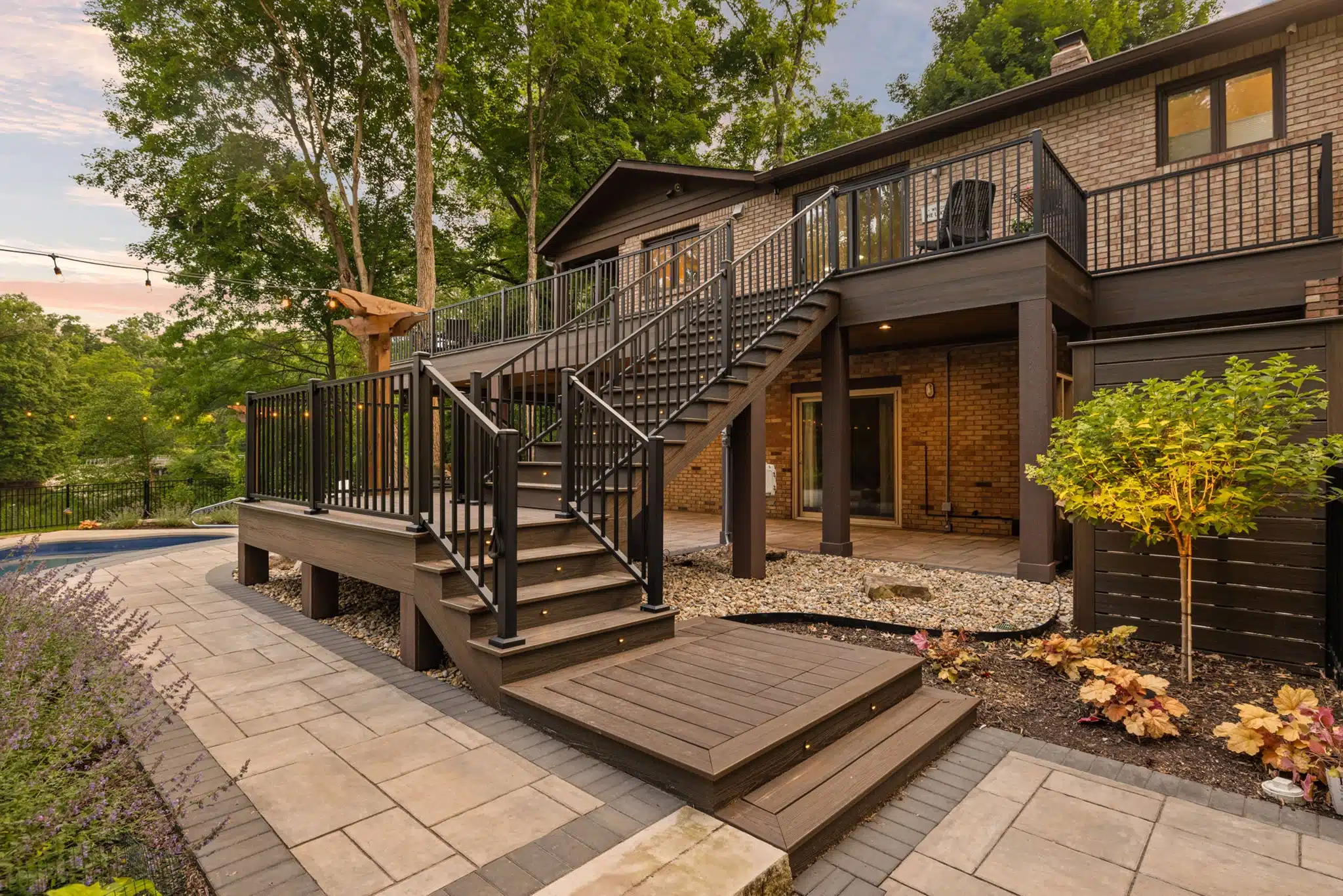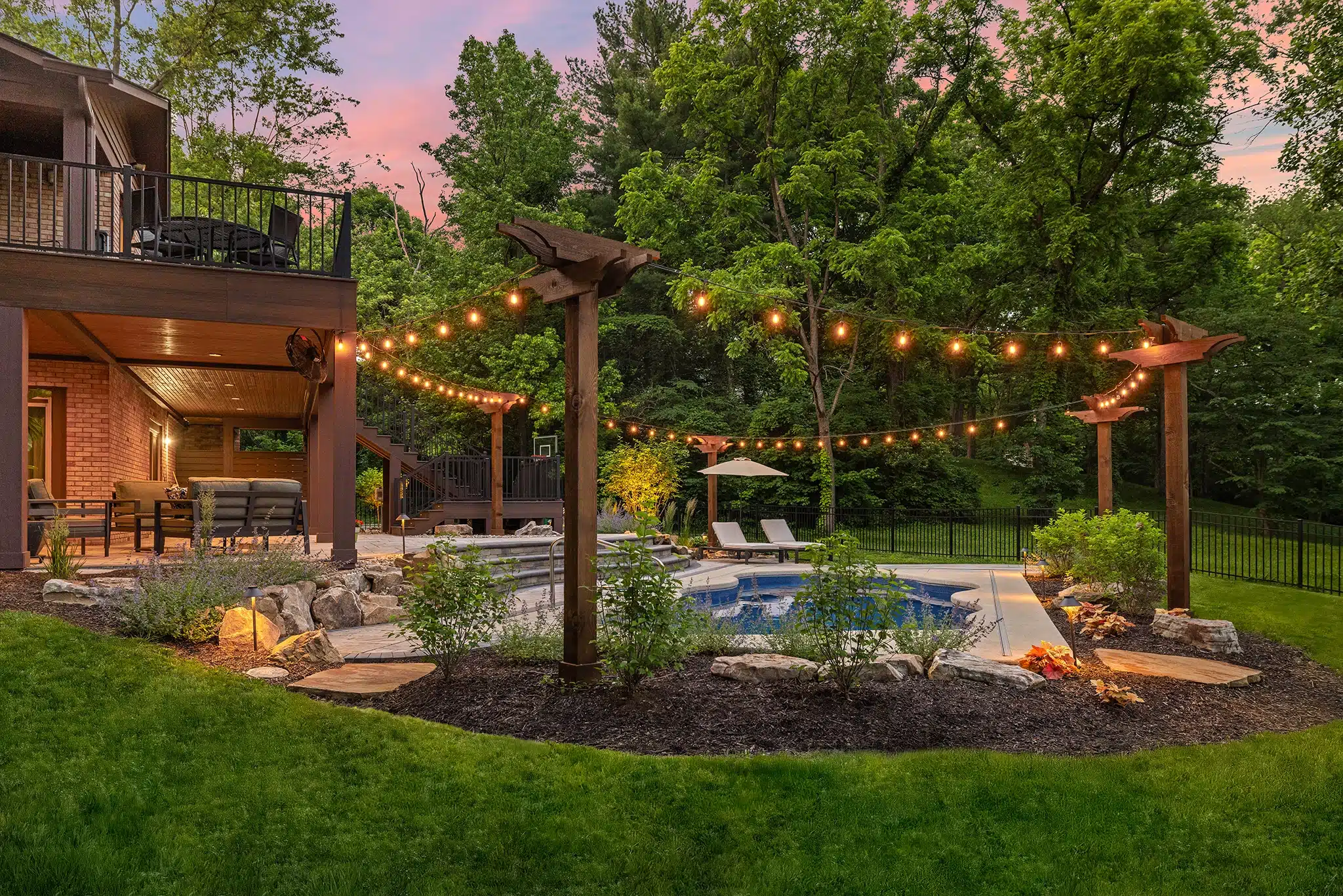 This custom composite deck turns a steep slope into a standout feature. Integrated lighting guides you to the pool below, while the covered lounge creates a year-round space to gather and unwind.