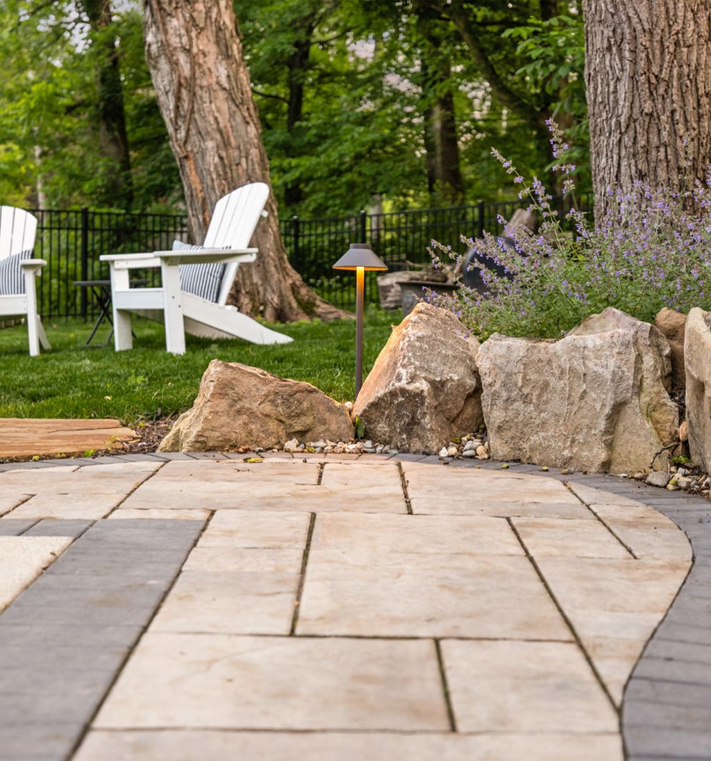 The completed space is accented by natural stone boulders, native plant materials, and lighting that accents the space above and around for elegant and functional evening entertainment.