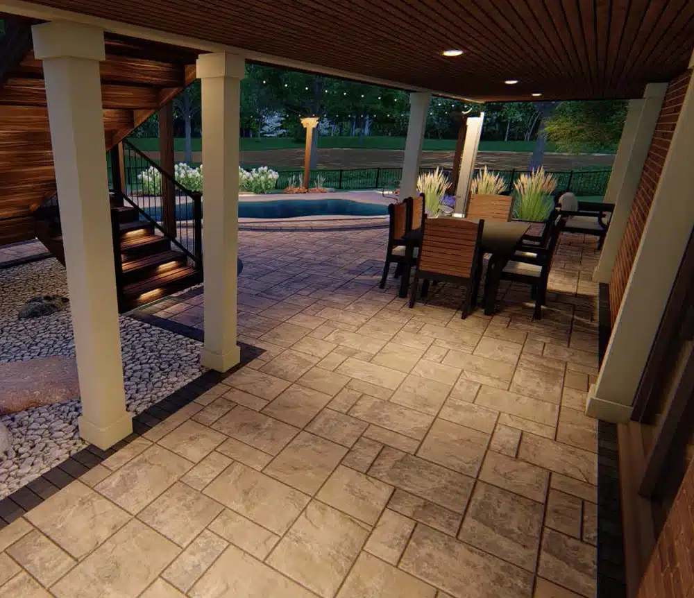 The BPI landscape architecture team used a collaborative approach while designing this unique space. Our team quickly determined that we should take advantage of the natural terrain to nestle the pool into the grade and allow for several individual spaces to flow together using these natural grade changes. The new deck was expanded to create additional living space off the upper level of the house, off the kitchen and living room, while also providing a covered living space below with views of the new pool. The main staircase was designed to allow for pedestrian traffic flow into the covered living space and for efficient access to the pool and the lawn areas.
