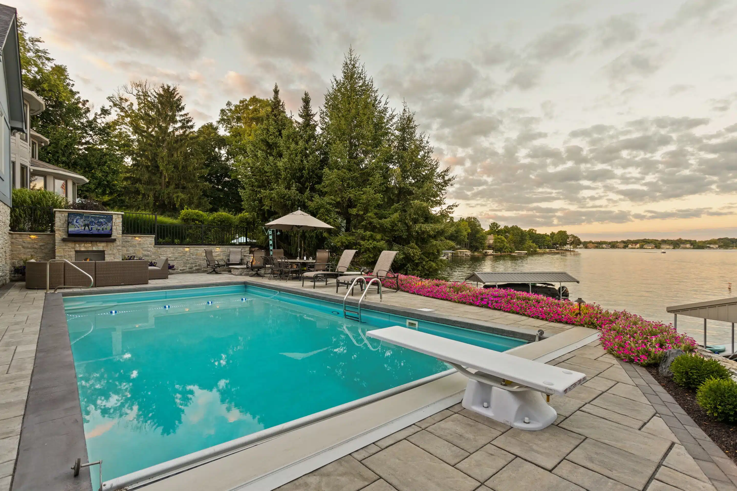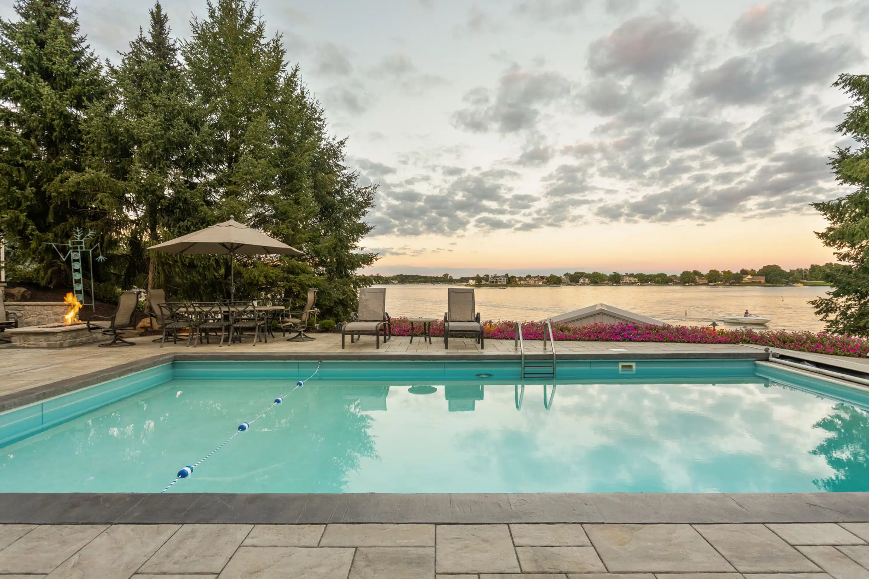 These homeowners soak in the best lake views from a secluded outdoor living space, complete with a terraced garden leading down to a private dock.